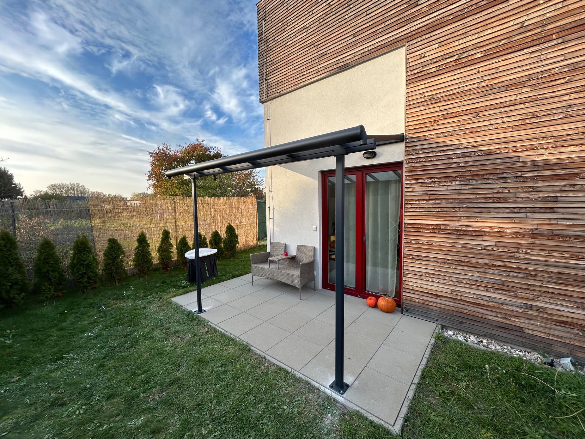 Exteriér kombinuje světlou fasádu s dřevěnými prvky, což dodává objektu nadčasový a reprezentativní vzhled. Součástí je také uzamykatelný skladový prostor.