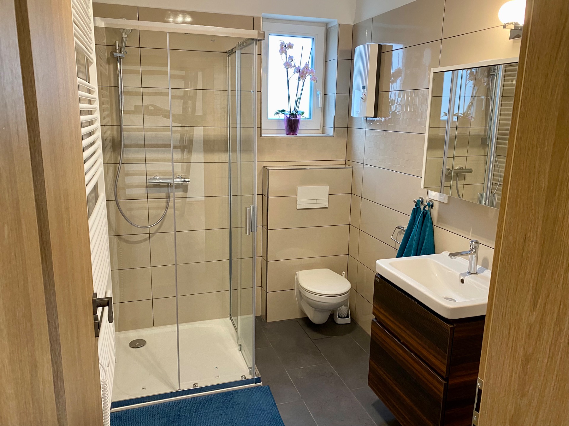 moderní koupelna se sprchovým koutem a velkoformátová dlažba