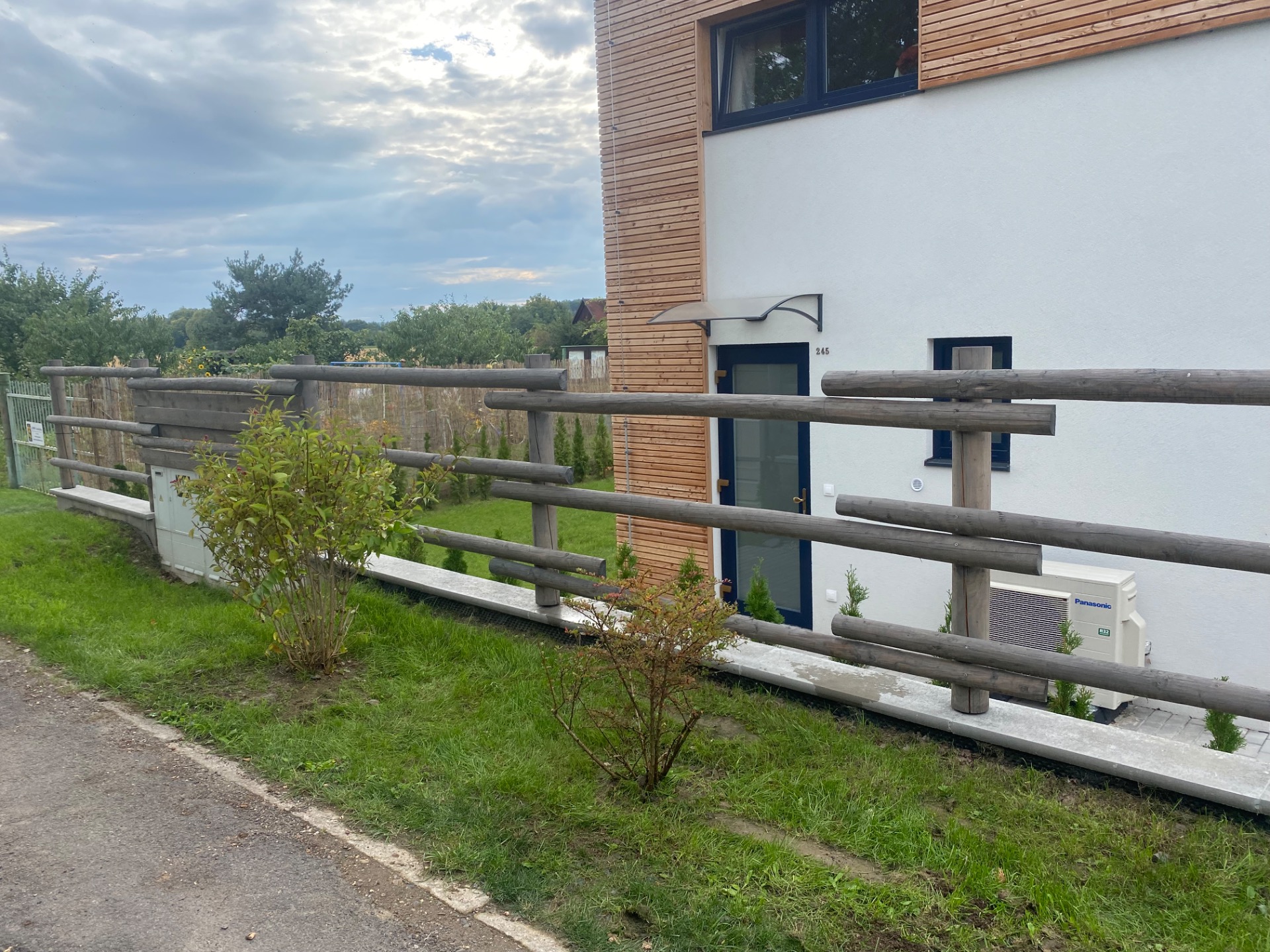 Exteriér kombinuje světlou fasádu s dřevěnými prvky, což dodává objektu nadčasový a reprezentativní vzhled. Součástí je také uzamykatelný skladový prostor.